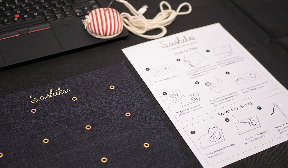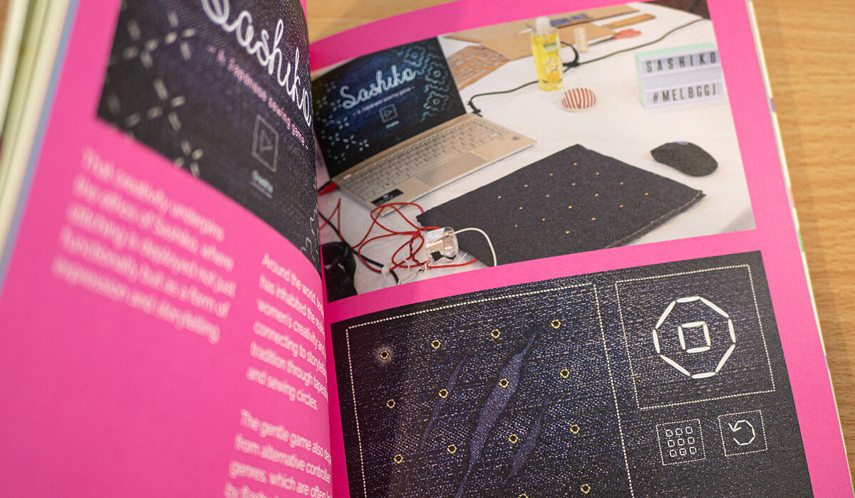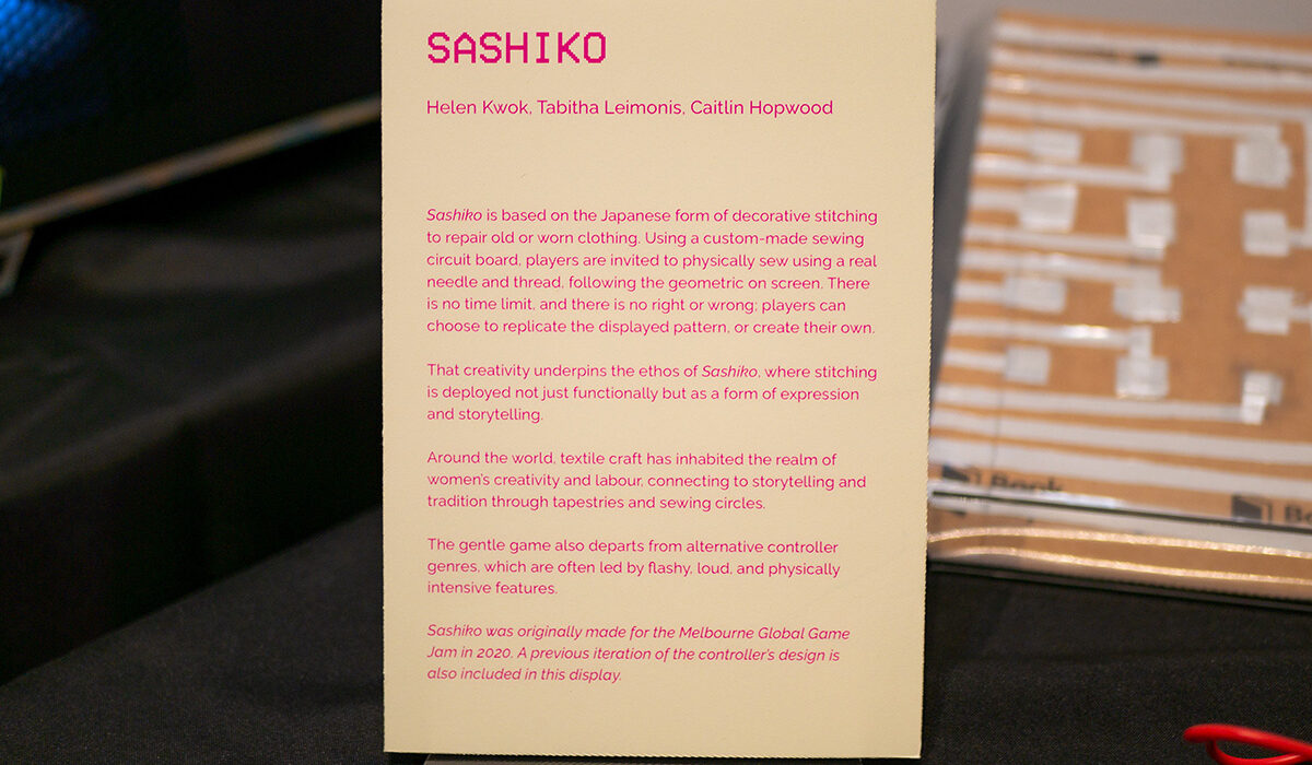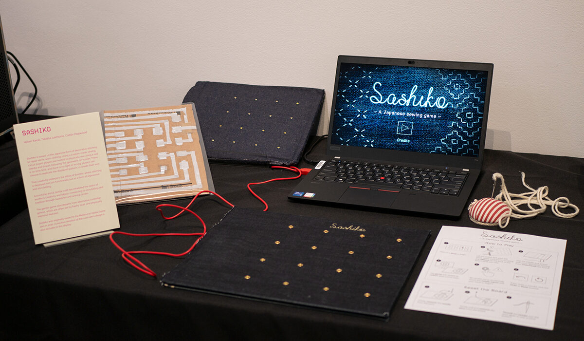 Featured on ABC Radio National program, Life Matters. Listen to our radio interview. Sashiko is a meditative sewing game based on the Japanese form of decorative stitching to reinforce or repair old and worn clothing, making it stronger and warmer. Players have to physically sew using a needle and thread on a custom-made sewing circuit board, following the geometric patterns displayed in the game. There is no time limit and there is no right or wrong. Players can choose to replicate the displayed pattern, or create their own. The sewing board is an alternative controller made from cardboard, denim and the Makey Makey. Sashiko was made as part of the 10th Melbourne Global Game Jam in 2020 in response to the theme REPAIR. The game was initially showcased to the public at the Community Play Party on 18 February 2020 at the South Melbourne Town Hall. The project was later exhibited with an updated controller as part of the Feminine Play exhibition from 4-18 October 2024 at Carlisle Street Arts Space, St Kilda Town Hall. Collaborators: Tabitha Leimonis (Programmer); Caitlin Hopwood (Sound Design)