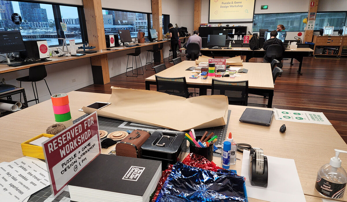 The Game Design Workshop series introduced children, teenagers, and adults to the concepts of puzzle/game design and the wonderful world of alternative controllers. In collaboration with City of Melbourne Libraries and SIGNAL, the workshops invited participants to transform the library into an escape room and make your own game controllers from everyday materials. Co-facilitatied with Chad Toprak at the following venues: Puzzle & Game Design – Library at the Dock Alt-Ctrl Construction – Library at the Dock Invent Your Own Game Controller – SIGNAL Co-facilitator: Chad Toprak Photo credits: Dan Soderstrom, Melbourne Knowledge Week & SIGNAL