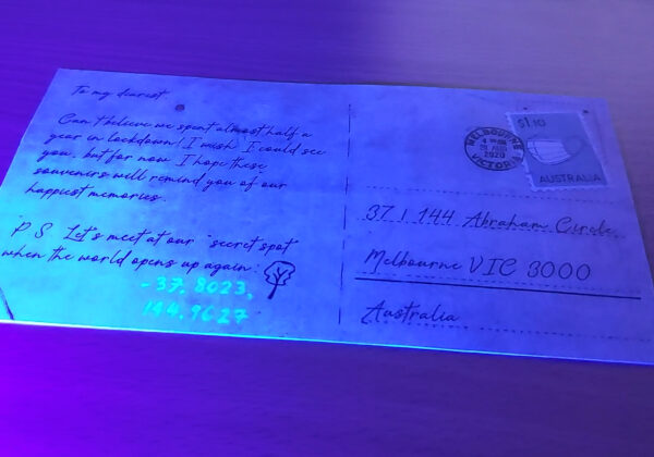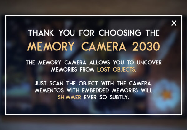 The year is 2030. You find a postcard dated from 2020, hand-made from one lover to another. Using your special ‘memory camera’, you scan the lost postcard to reveal its embedded memories. One final puzzle remains: where is the “secret location” that the lovers were going to meet?