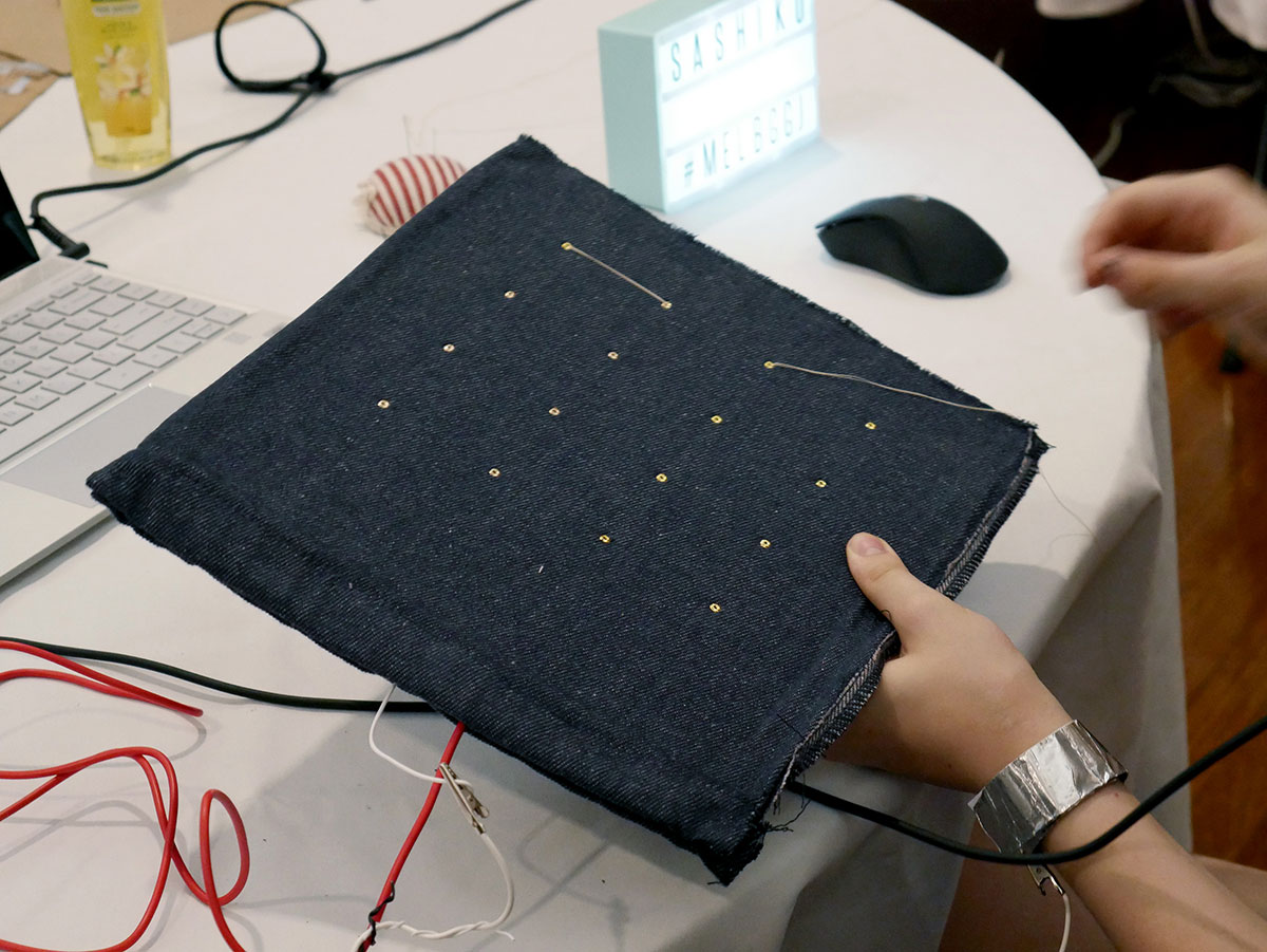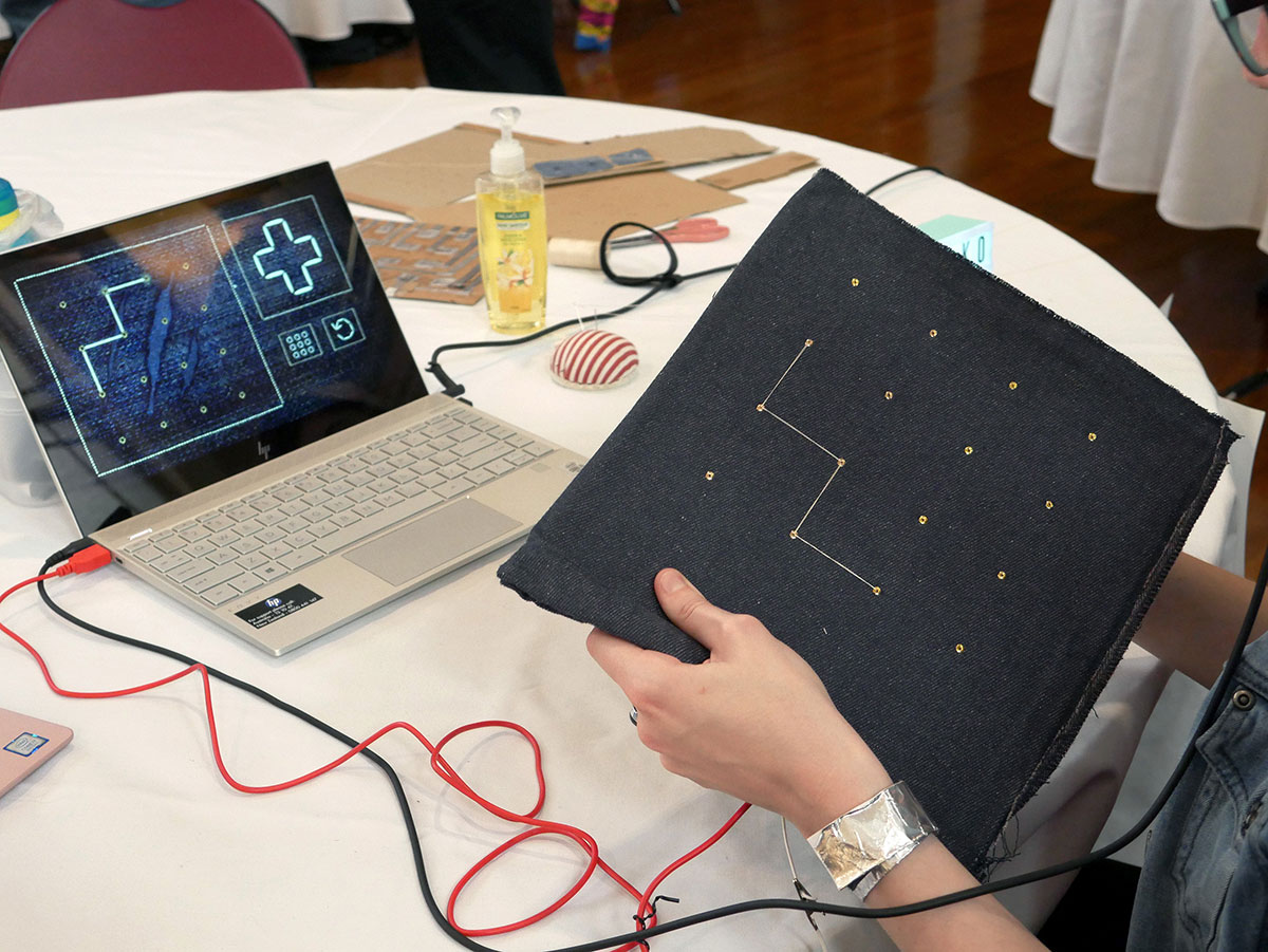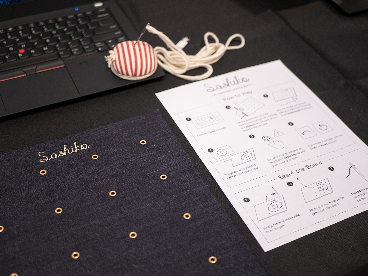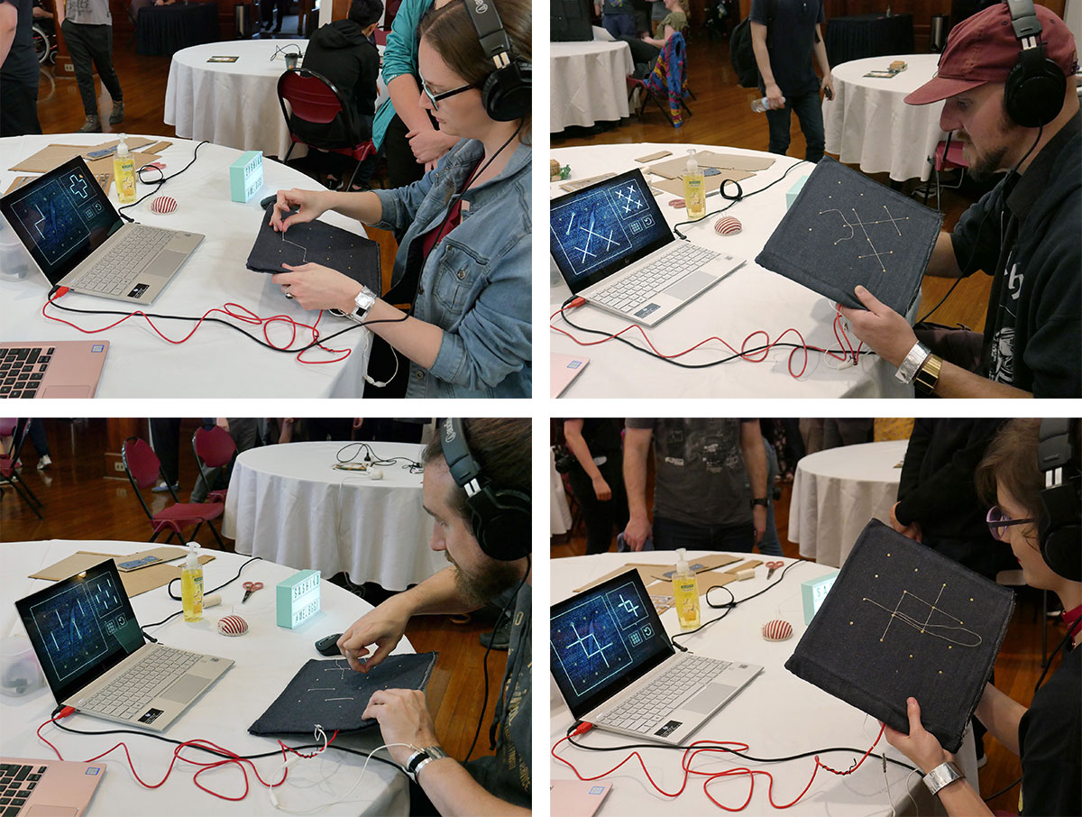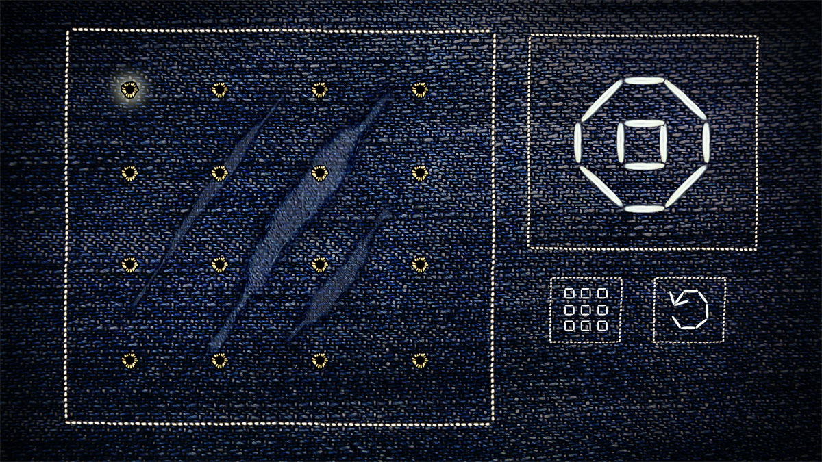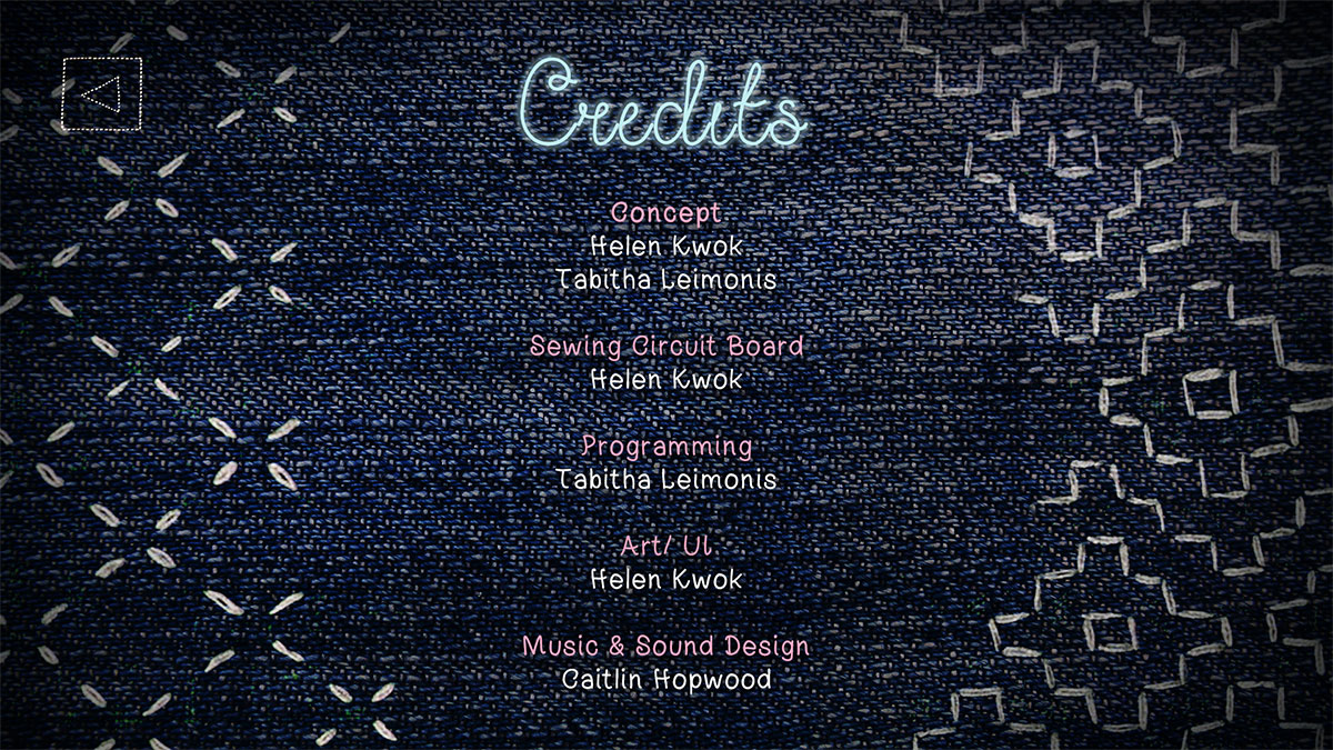Players have to physically sew using a needle and thread on a custom-made sewing circuit board, following the geometric patterns displayed in the game. There is no time limit and there is no right or wrong. Players can choose to replicate the displayed pattern, or create their own. The sewing board is an alternative controller made from cardboard, denim and the Makey Makey.