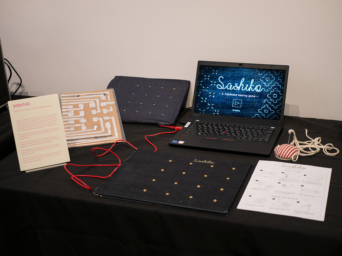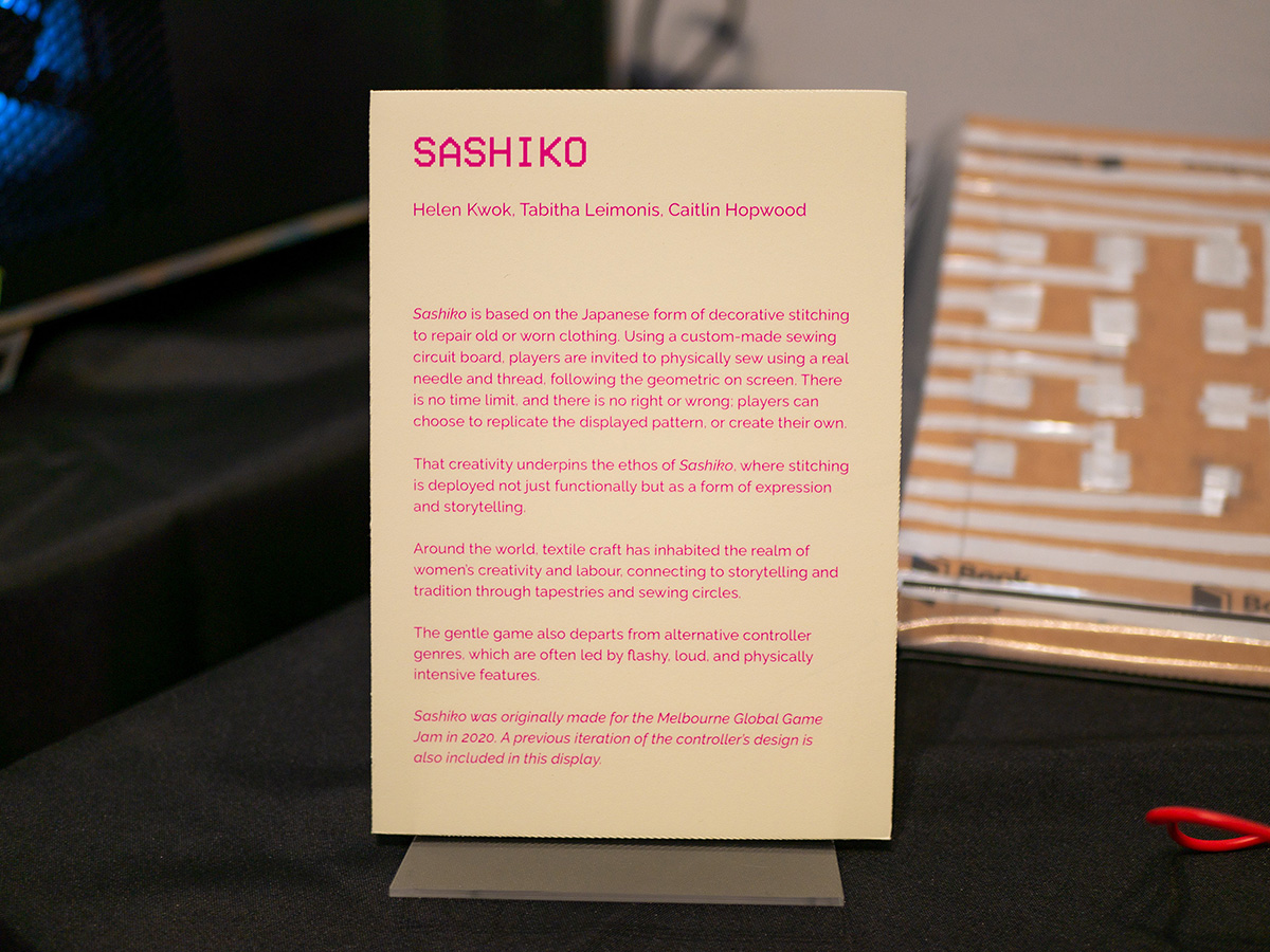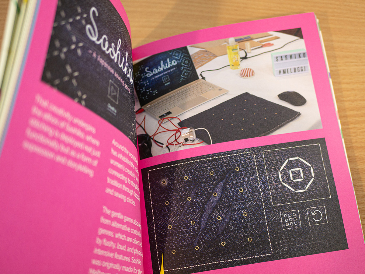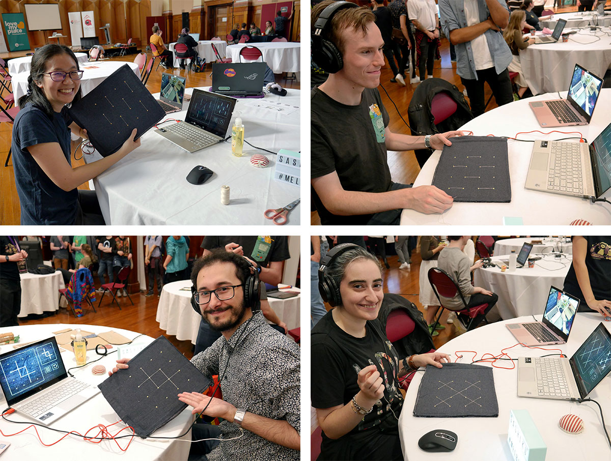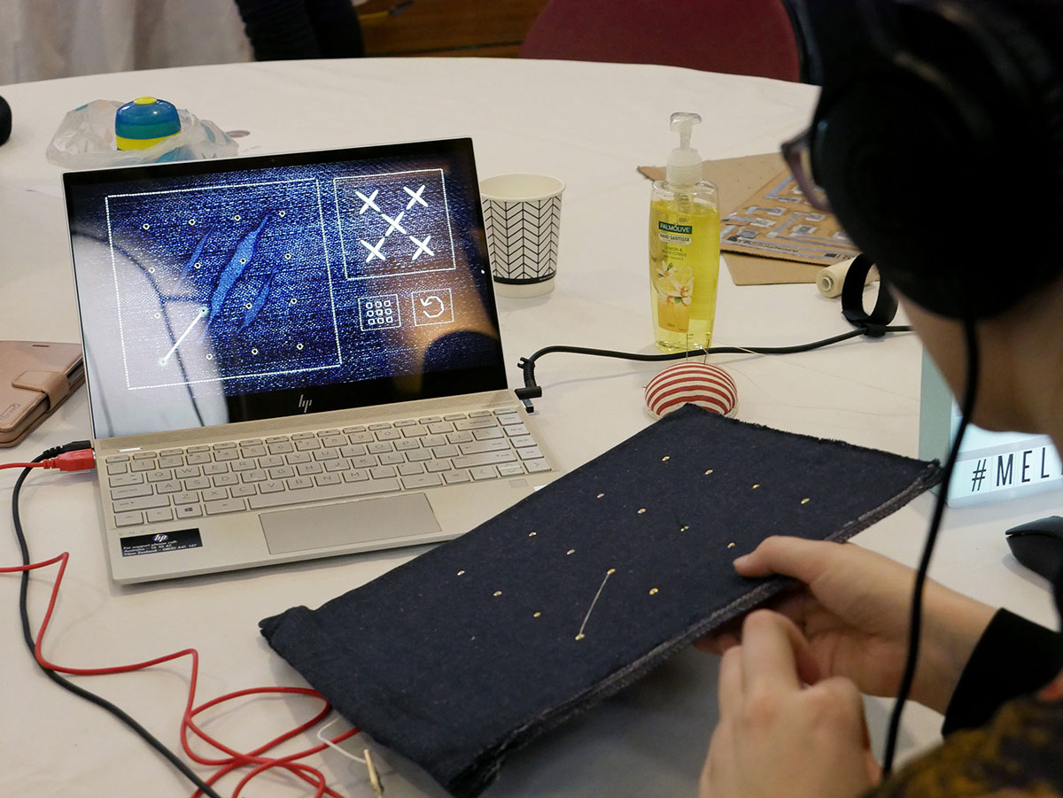 Players have to physically sew using a needle and thread on a custom-made sewing circuit board, following the geometric patterns displayed in the game. There is no time limit and there is no right or wrong. Players can choose to replicate the displayed pattern, or create their own. The sewing board is an alternative controller made from cardboard, denim and the Makey Makey.